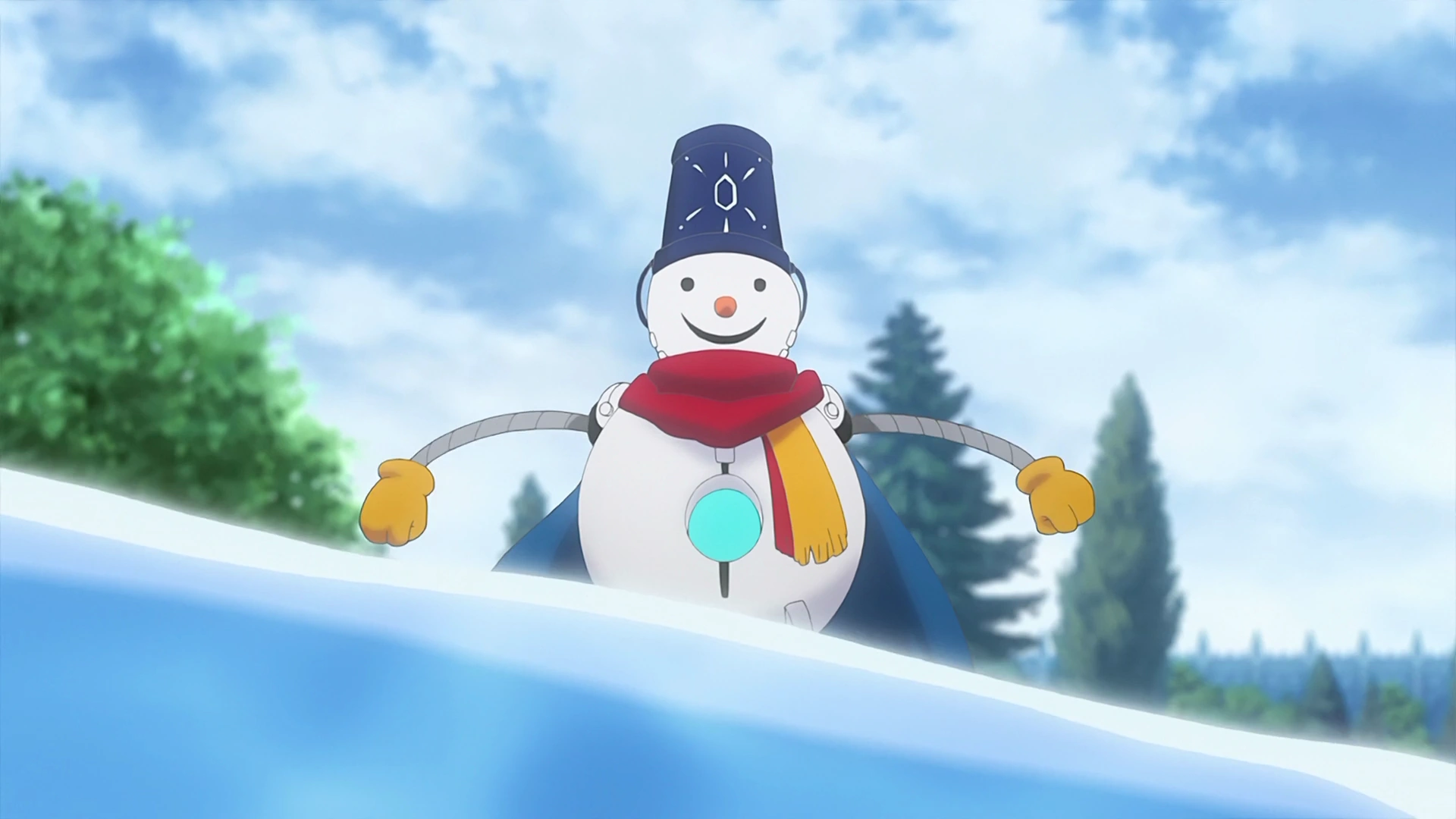 Jack Frost has a snow man-like form. It has a blue pale hat, with a white snowflake design at its centre, black eyes, a carrot-like nose, a black mouth, a red and orange scarf, with fringed tips, wrapped around and attached to the lower part of its head, grey arms, orange hands, a vertical black stripe at the centre of its body, a blue-green spot at the centre of the stripe, a vertical black stripe from the centre of the back of its body to the bottom of it forming into a detail, grey legs, blue feet, with ice-skating blades, and a blue lined white cape.